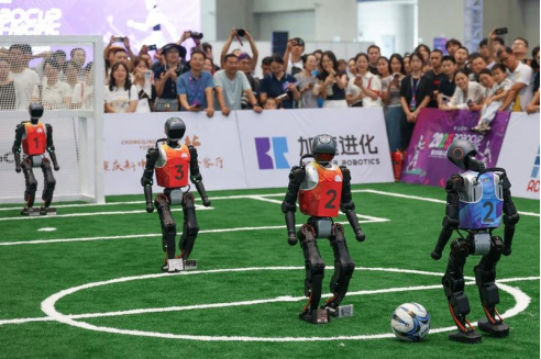 Visitors watch a humanoid robot football game during the 2025 World Smart Industry Expo in Southwest China's Chongqing municipality, on Sept 5, 2025. In less than two months, China has fully alloc