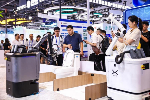 People learn about a self-cleaning robot at the 4th Global Digital Trade Expo in Hangzhou, East China's Zhejiang province, Sept 25, 2025.China's retailers and exporters, in an era marked by th