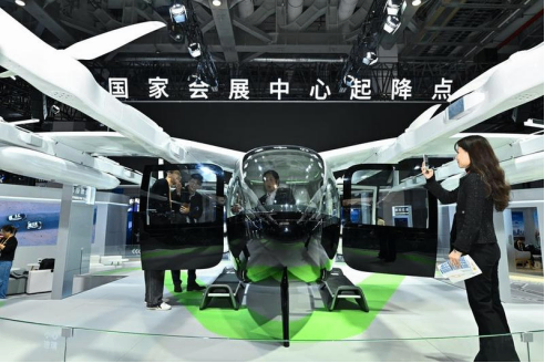 Visitors try the Matrix 1 electric vertical takeoff and landing aircraft at the booth of VerTaxi at the Automobile and Smart Mobility exhibition area of the eighth China International Import Expo (CII