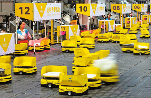 Robots sort express parcels at a logistics center in Huzhou, East China's Zhejiang province, on Monday for this year's Singles Day carnival, an online shopping festival which culminated on Tue