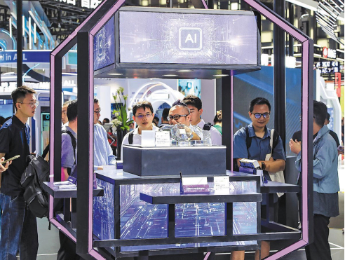 Guests attending the 2025 World Artificial Intelligence Conference show avid interest in the artificial intelligence chips produced by MetaX, a Shanghai-based chip company, on July 29 at the event in Shanghai. SHI HUA / FOR CHINA DAILY
