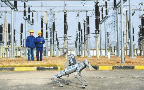 A smart robot and workers inspect power supply equipment at a 220-kilovolt substation in Chuzhou, Anhui province, on Jan 6. SONG WEIXING/FOR CHINA DAILY